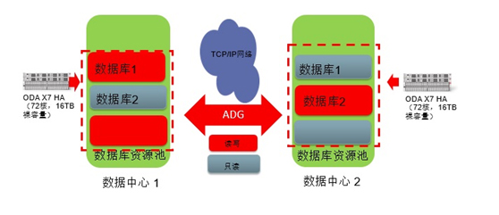 · 数据库1、数据库2等运行在2台ODA 分别部署在数据中心1和数据中心2。
