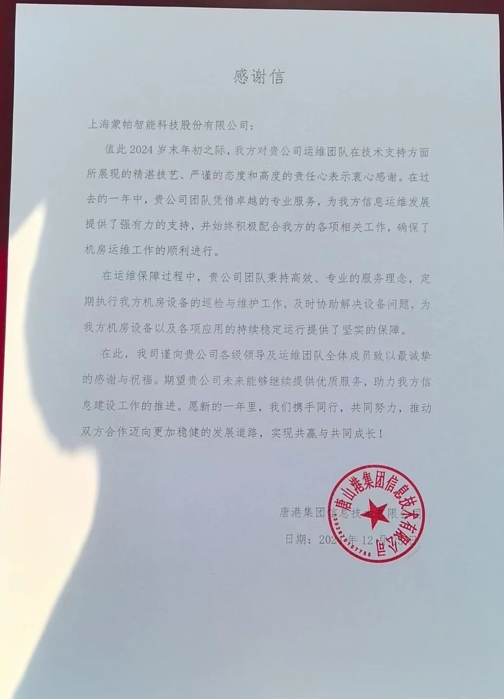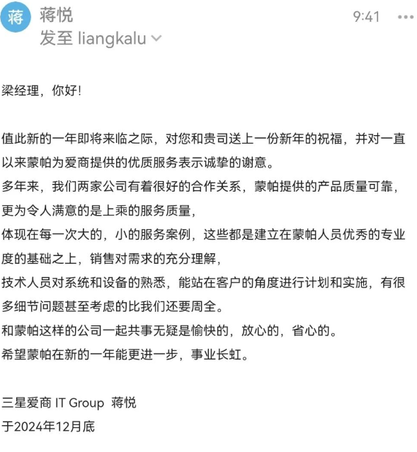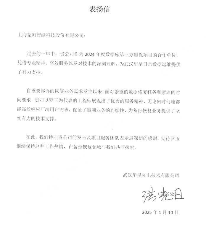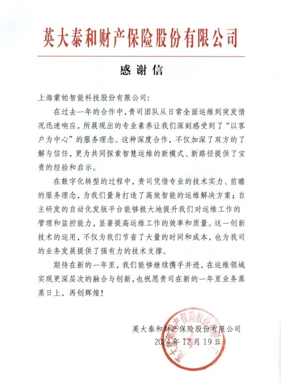 蒙帕始终秉承着“为客户提供100%满意的专业服务”的理念,致力于提供高效的运维解决方案。国网青海电力、唐山港集团、英大泰和财险、华星光电、三星、好丽友等众多不同行业的头部企业对蒙帕过去一年的专业运维服务与驻场技术人员的辛勤付出给予了高度赞扬肯定。