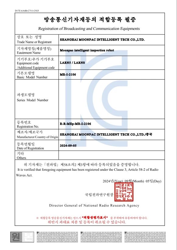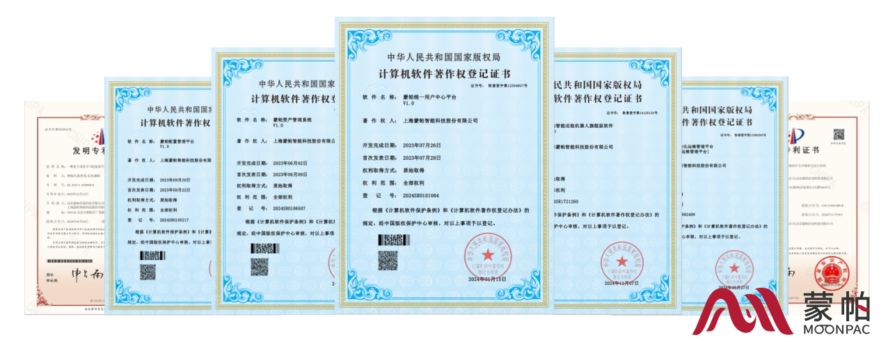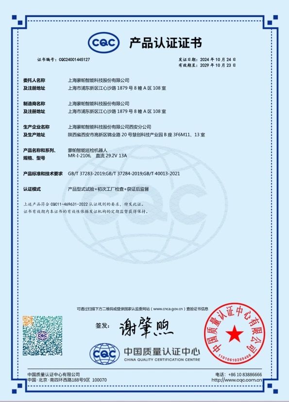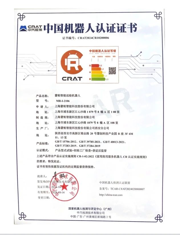 2024年,蒙帕智能巡检机器人先后获得国内CR认证、CQC认证、锂电池认证及韩国KC认证,标志着机器人在产品质量、安全性和可靠性方面达到了国内及国际权威机构的严格标准,也是蒙帕在产品研发道路上追求卓越、不断进步的体现。
